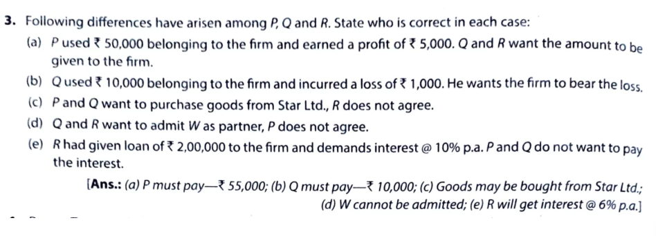 e) R had given a loan of ₹ 2,00,000 to the firm and demanded interest @ 10%. P and Q do not want to pay the interest.