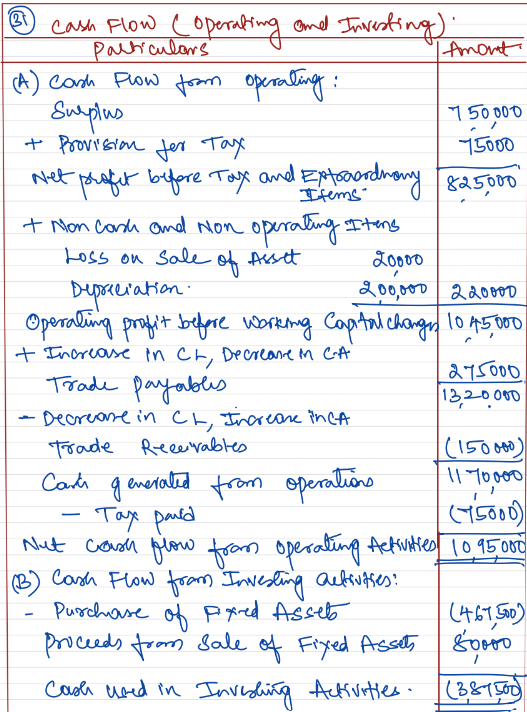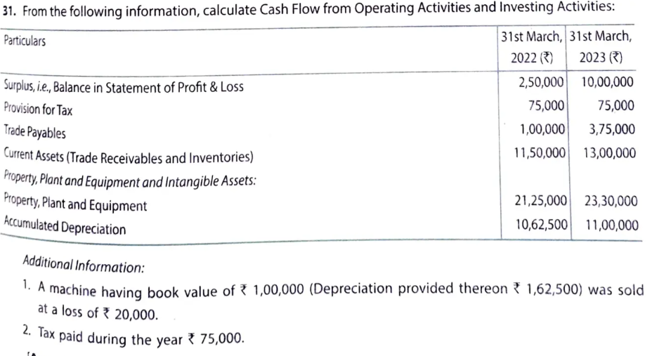 From the following information, Calculate Cash Flow from Operating Activities and Investing Activities:
