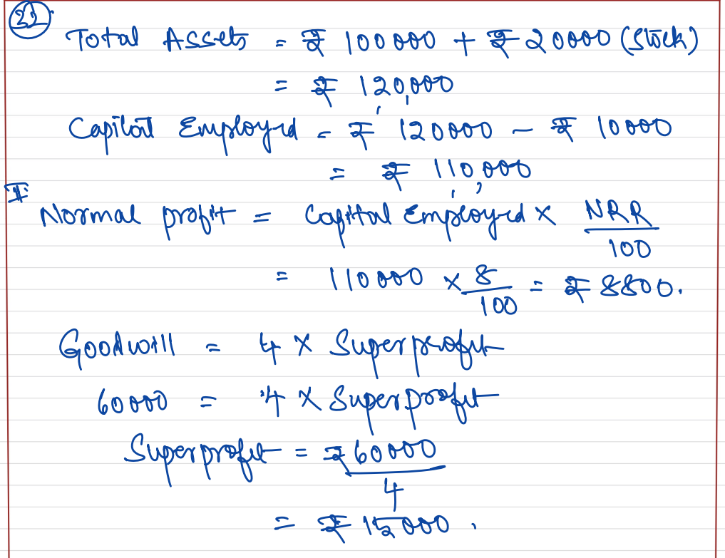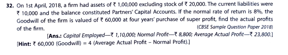 On 1st April 2018, the firm had assets of ₹ 1,00,000 excluding stock of ₹ 20,000. The current liabilities were ₹ 10,000 and the balance constituted Partner’s Capital Accounts. If the normal rate of return is 8%, the Goodwill of the firm is valued at ₹ 60,000 at four years’ purchase of super profit, find the actual profits of the firm.