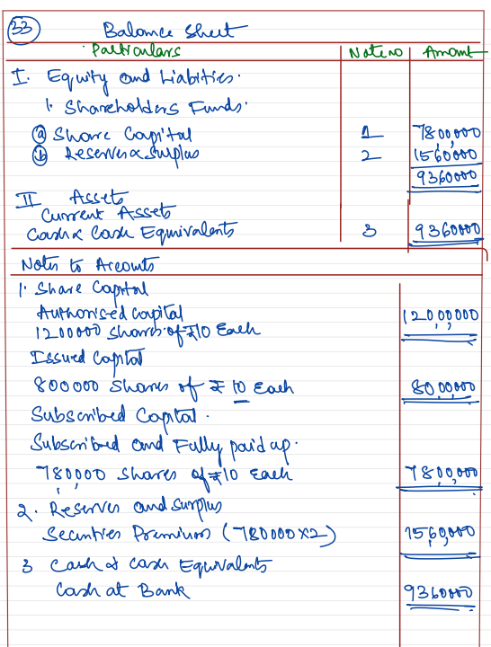 Public applied for 7,80,000 shares. All the money was duly received. Prepare an extract of Balance Sheet of Sarang Ltd. as per Schedule III, Part I of the Companies Act, 2013, disclosing the above information. Also prepare ‘Notes to Accounts’ for the same.