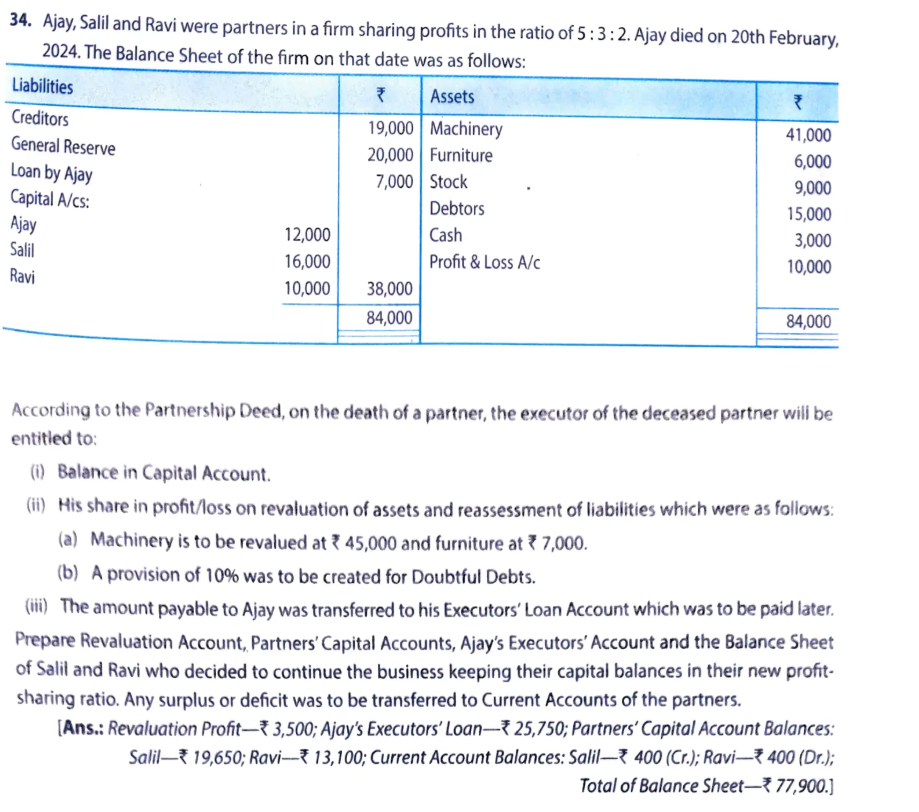 Ans.: Karim’s share of Goodwill = ₹ 1,05,000; Karim’s share of Profit = ₹ 22,500; Amount transferred to Karim’s Executors = ₹ 7,35,000.]