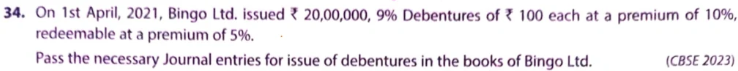 On 1st April, 2021, Bingo Ltd. issued ₹ 20,00,000, 9% Debentures of ₹ 100 each at a premium of 10% redeemable at a premium of 5%.