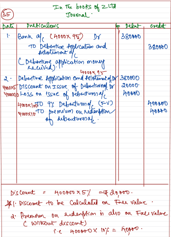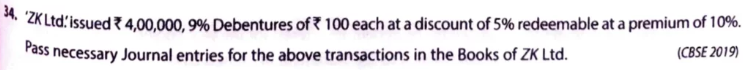 ZK Ltd.’ issued ₹ 4,00,000, 9% Debentures of ₹ 100 each at a discount of 5% redeemable at a premium of 10%. Pass necessary Journal entries for the above transactions in the Books of ZK Ltd.