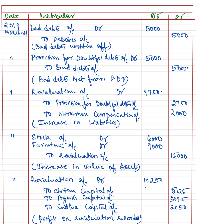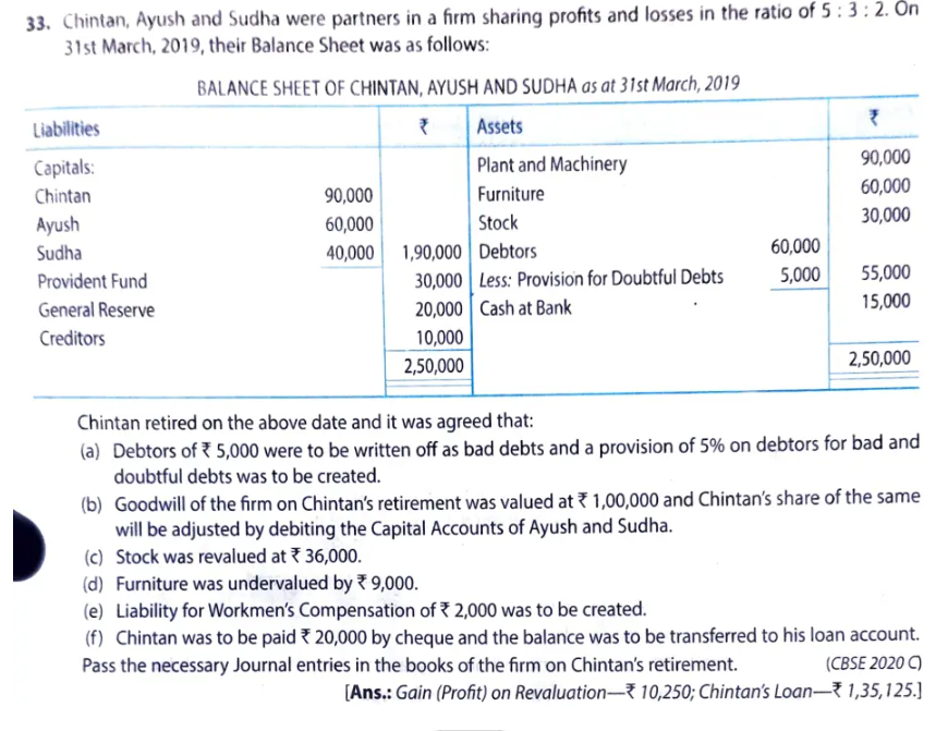 Chintan, Ayush and Sudha were partners in a firm sharing profits and losses in the ratio of 5 : 3 : 2. on 31st March, 2019, their Balance Sheet was as follows: