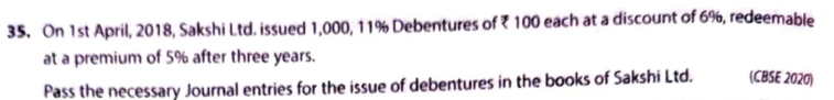 On 1st April, 2018, Sakshi Ltd. issued 1,000, 11% Debentures of ₹ 100 each at a discount of 6%, redeemable at a premium of 5% after three years.