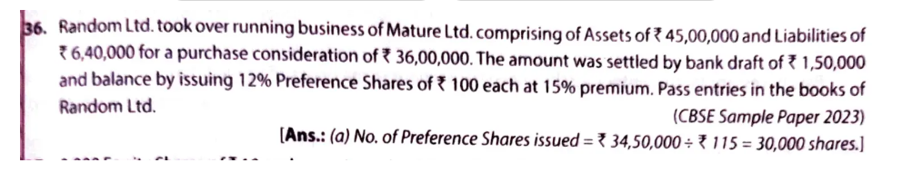 Random Ltd. took over running business of Mature Ltd. comprising of Assets of ₹ 45,00,000 and Liabilities of ₹ 6,40,000 for a purchase consideration of ₹ 36,00,000. The amount was settled by bank draft of ₹ 1,50,000 and balance by issuing 12% Preference Shares of ₹ 100 each at 15% premium. Pass entries in the books of Random Ltd.