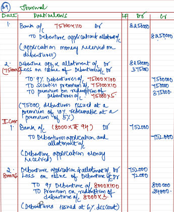 - Issued 8,000, 9% Debentures of ₹ 100 each at a discount of 6% redeemable at a premium of 3% after 5 years.