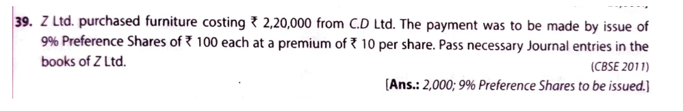 Z Ltd. purchased furniture costing ₹ 2,20,000 from C.D Ltd. The payment was to be made by issue of 9% Preference Shares of ₹ 100 each at a premium of ₹ 10 per share. Pass necessary Journal entries in the books of Z Ltd.