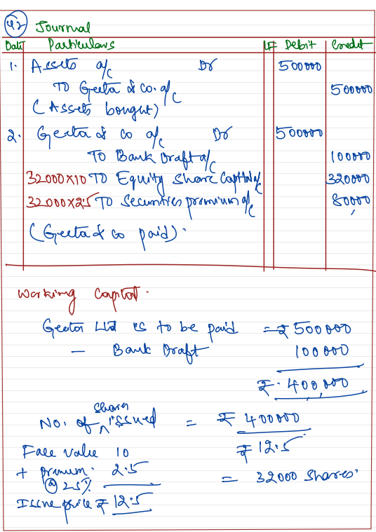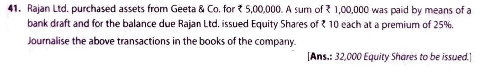 Rajan Ltd Purchased assets from Geeta & Co. for 5,00,000. A sum of ₹ 1,00,000 was paid by means of a bank draft and for the balance due Rajan Ltd. issued Equity Shares of ₹ 10 each at a premium of 25%.