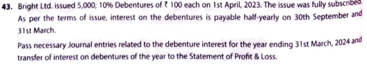Bright Ltd. issued 5,000; 10% Debentures of ₹ 100 each on 1st April, 2022. The issue was fully subscribed As per the terms of issue, interest on the debentures is payable half-yearly on 30th September and 31st March.