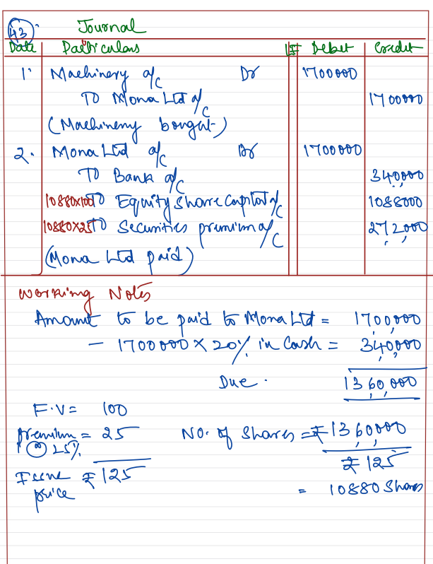 Sona Ltd purchased machinery costing ₹ 17,00,000 from Mona Ltd. Sona Ltd. paid 20% of the amount by cheque and for the balance amount issued Equity Shares of ₹ 100 each at a premium of 25%.