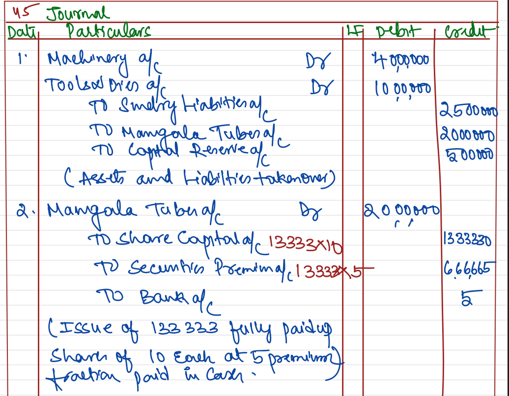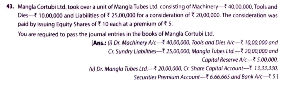 Mangla Cortubi Ltd. took over a unit of Mangla Tubes Ltd. consisting of Machinery – ₹ 4,00,000, Tools and Dies – ₹ 10,00,000 and Liabilities of ₹ 25,00,000 for a consideration of ₹ 20,00,000. The consideration was paid by issuing Equity Shares of ₹ 10 each at a premium of ₹ 5.