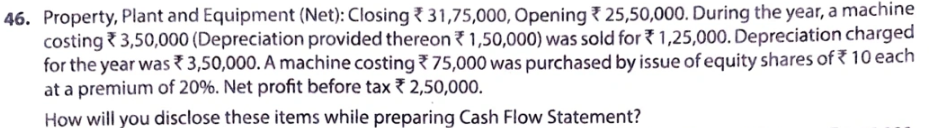 Property, Plant and Equipment (Net): Closing ₹ 31,75,000, Opening ₹ 25,50,000. During the year, a machine costing ₹ 3,50,000 (Depreciation provided thereon ₹ 1,50,000) was sold for ₹ 1,25,000. Depreciation charged for the year was ₹ 3,50,000. A machine costing ₹ 75,000 was purchased by issue of equity shares of ₹ 10 each at a premium of 20%. Net profit before tax ₹ 2,50,000.