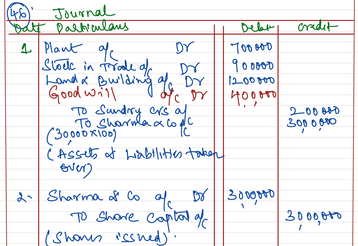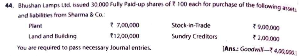 Bhushan Lamps Ltd issued 30,000 Fully Paid up shares of ₹ 100 each for purchase of the following assets and liabilities from Sharma & Co.: