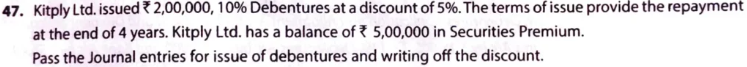 Kitply Ltd. issued ₹ 2,00,000, 10% Debentures at a discount of 5%. The terms of issue provide the repayment at the end of 4 years. Kitply Ltd. has a balance of ₹ 5,00,000 in Securities Premium.