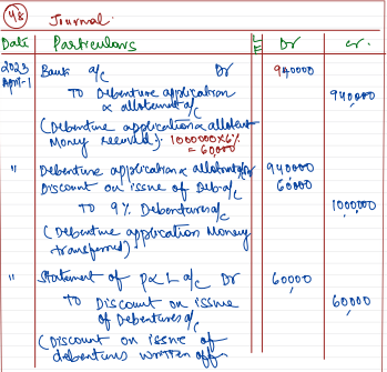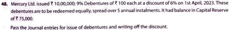 Mercury Ltd. issued ₹ 10,00,000; 9% Debentures of ₹ 100 each at a discount of 6% on 1st April, 2022. These debentures are to be redeemed equally. Spread over 5 annual instalments. It had balance in Capital Reserve of ₹ 75,000.