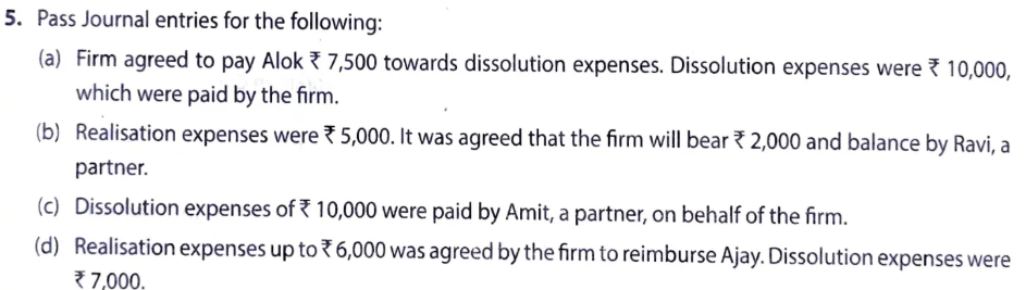 - Firm agreed to pay Alok ₹ 7,500 towards dissolution expenses. Dissolution expenses were ₹ 5,000, which were paid by the firm.