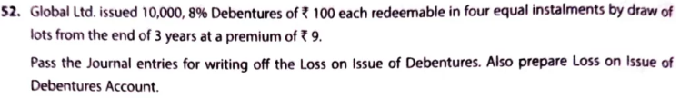 Global Ltd. issued 10,000, 8% Debentures of ₹ 100 each redeemable in four equal instalments by draw of lots from the end of 3 years at a premium of ₹ 9.