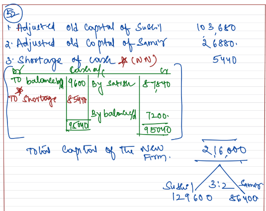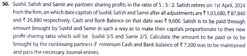 Sushil, Satish and Samir are partners sharing profits in the ratio of 5 : 3 : 2. Satish retires on 1st April, 2023 from the firm, on which date capitals of Sushil, Satish and Samir after all adjustments are ₹ 1,03,680, ₹ 87,840 and ₹ 26,880 respectively. The Cash and Bank Balance on that date was ₹ 9,600. Satish is to be paid through amount brought by Sushil and Samir in such a way as to make their capitals proportionate to their new profit sharing ratio which will be Sushil 3/5 and Samir 2/5. Calculate the amount to be paid or to be brought by the continuing partners if minimum Cash and Bank balance of ₹ 7,200 was to be maintained and pass the necessary Journal entries.
