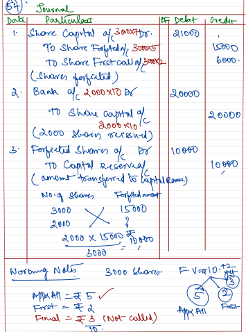 Ratan Ltd forfeited 3,000 shares of ₹ 10 each (issued at ₹ 2 premium) for non-payament of first call of ₹ 2 per share. Final call of ₹ 3 per share was not yet made. Out of thse, 2,000 shares were re-issued at ₹ 10 per share as fully paid. Pass entries for forfeiture and reissue of shares.