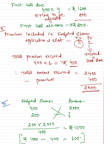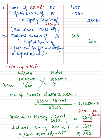 Applications for 1,50,000 shares were received and pro rata allotment was made to all the applicants. Excess application money was adjusted towards sums due on calls. Parth, a shareholder who had applied for 600 shares did not pay the first call. His shares were forfeited. The second and final call was not yet made. Half of the forfeited shares were reissued at ₹ 8 per share fully paid-up.
