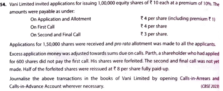 Journalise the above transactions in the books of Vani Limited by opening Calls-in-Arrears and Calls-in-Advance Account wherever necessary.