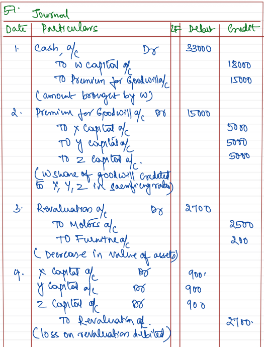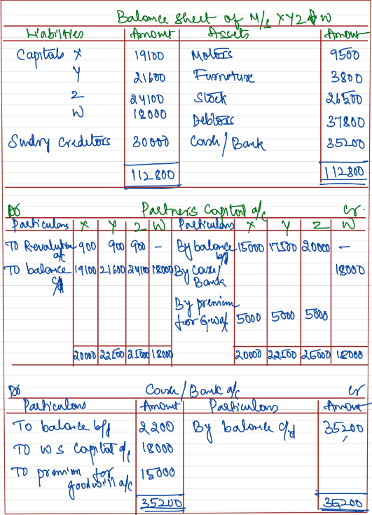 X, Y and Z are equal partners with capitals of ₹ 15,000; ₹ 17,500 and ₹ 20,000 respectively. They agree to admit W into equal partnership upon payment in cash ₹ 15,000 for 1/4th share of the goodwill and ₹ 18,000 as his capital, both sums to remain in the business. The liabilities of the old firm were ₹ 30,000 and the assets, apart from cash, consist of Motors ₹ 12,000, Furniture ₹ 4,000, Stock ₹ 26,500 and Debtors ₹ 37,800. The Motors and Furniture were revalued at ₹ 9,500 and ₹ 3,800 respectively.