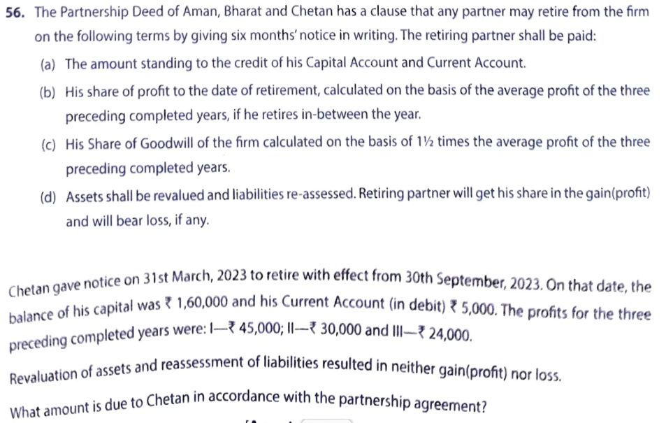 The Partnership Deed of Aman, Bharat and Chetan has a clause that any partner may retire from the firm on the following terms by giving six months’ notice in writing. The retiring partner shall be paid: