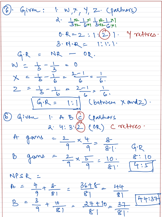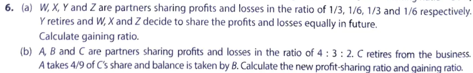 - W, X, Y and Z are partners sharing profits and losses in the ratio of 1/3, 1/6, 1/3 and 1/6 respectively. Y retires and W, X and Z decide to share the profits and losses equally in future. Calculate gaining ratio.