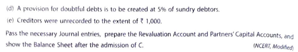 Pass the necessary Journal entries, prepare the Revaluation Account and Partner’s Capital Accounts and Show the Balance Sheet after the admission of C.