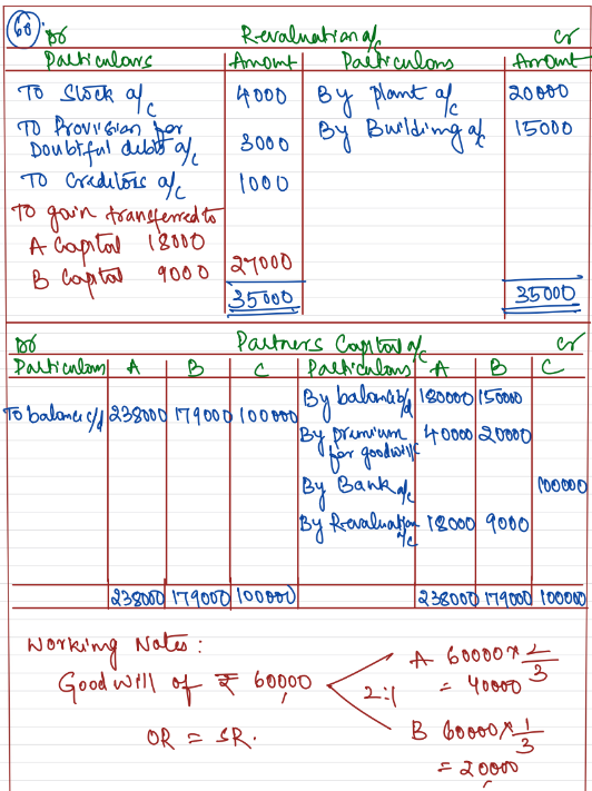 - C will bring ₹ 1,00,000 as his capital and ₹ 60,000 as his share of goodwill for 1/4th share in the profits.