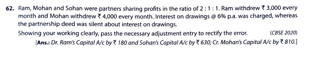 Ram, Mohan, and Sohan were partners sharing profits in the ratio of 2 : 1 : 1. Ram withdrew ₹ 3,000 every month and Mohan withdrew ₹4,000 every month. Interest on drawings @ 6% p.a. was charged, whereas the partnership deed was silent about interest on drawings.