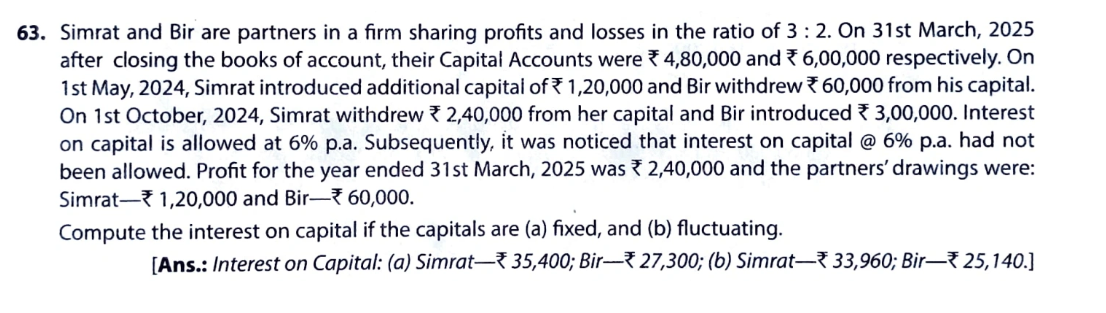 [Ans: Interest on Capital: (a) Simrat – ₹ 35,400; Bir – ₹27,300; (b) Simrat – ₹ 33,960; Bir – ₹ 25140.]