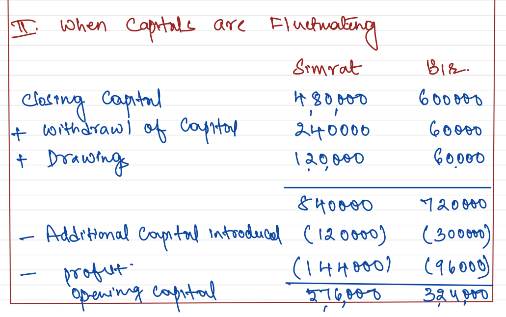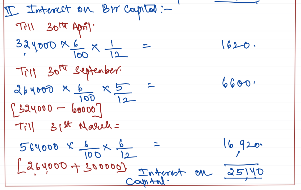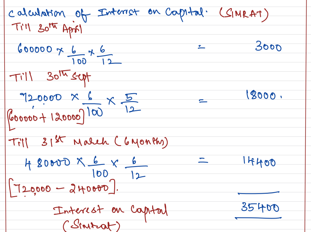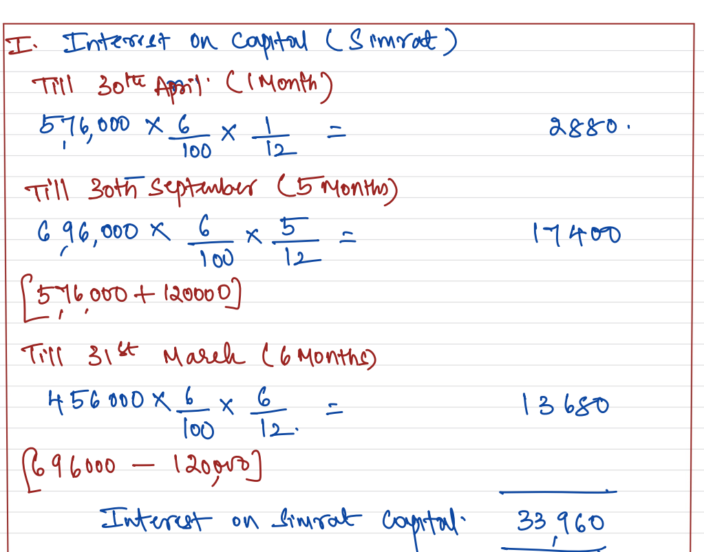 Simrat and Bir are partners in a firm sharing profits and losses in the ratio of 3 : 2. On 31st March 2023 after closing the books of account, their capital Accounts stood at ₹ 4,80,000 and ₹ 6,00,000 respectively. on 1st May 2022, Simrat introduced an additional capital of ₹ 1,20,000 and Bir withdrew ₹ 60,000 from his capital. On 1st October 2022, Simrat withdrew ₹ 2,40,000 from her capital and Bir introduced ₹ 3,00,000. Interest on capital is allowed at 6% p.a. Subsequently, it was noticed that interest on capital @ 6% p.a. had been omitted. Profit for the year ended 31st March 2023 amounted to ₹ 2,40,000 and the partner’s drawings had been: Simrat – ₹ 1,20,000 and Bir – ₹ 60,000.