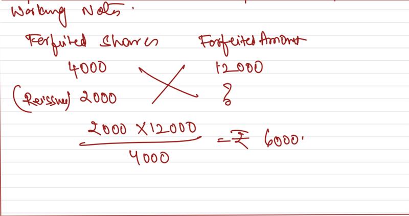 A company forfeited 4,000 shares of ₹ 10 each fully called-up, on which application money of ₹ 3 each has been paid. Out of these, 2,000 shares were reissued as fully paid-up for ₹ 18,000.
