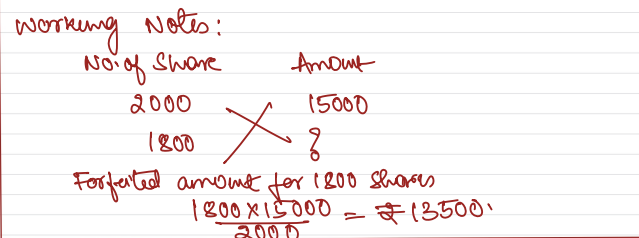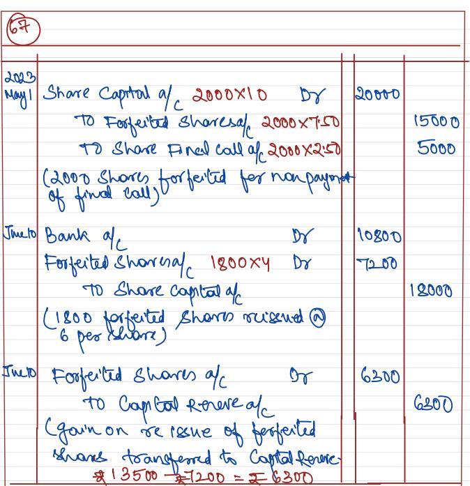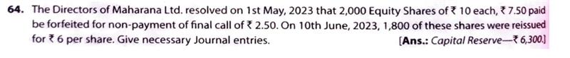 The Directors of Maharana Ltd. resolved on 1st May, 2020 that 2,000 Equity Shares of ₹ 10 each, ₹ 7.50 paid be forfeited for non-payment of final call of ₹ 2.50. On 10th June, 2020, 1,800 of these shares were reissued for ₹ 6 per share. Give necessary Journal entries. Give necessary Journal entries.