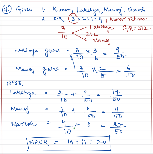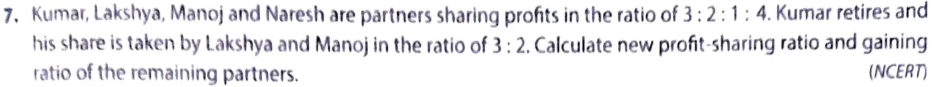 Kumar, Lakshya, Manoj and Naresh are partners sharing profits in the ratio of 3 : 2 : 1 : 4. kumar retires and his share is taken by Lakshya and Manoj in the ratio of 3 : 2. Calculate new profit sharing ratio and gaining ratio of the remaining partners.