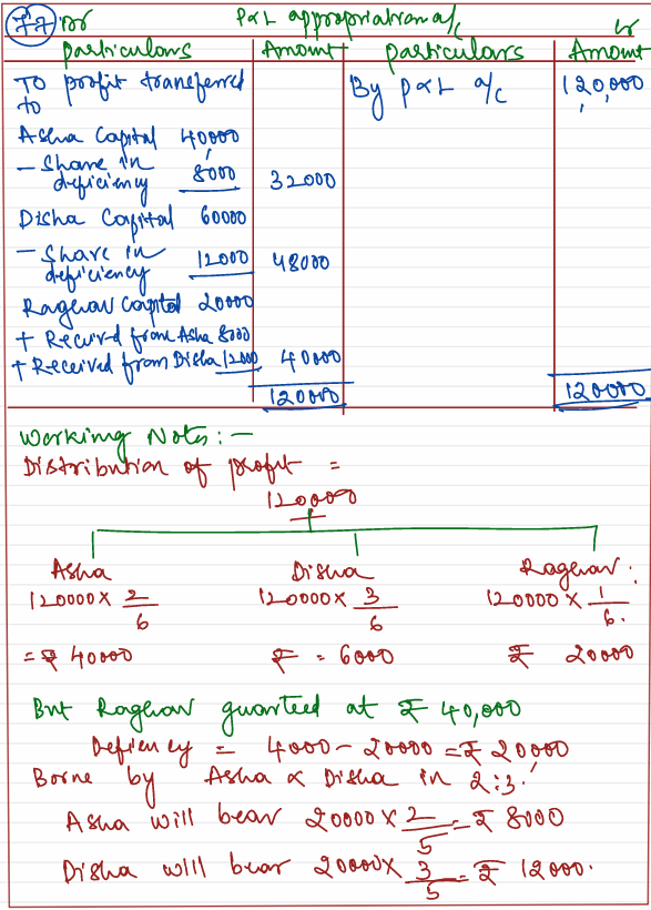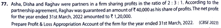 Asha, Disha and Raghav were partners in a firm sharing profits in the ratio of 2 : 3 : 1. According to the partnership agreement, Raghav was guaranteed an amount of ₹ 40,000 as his share of profits. The net profit for the year ended 31st March, 2022 amounted to ₹ 1,20,000.