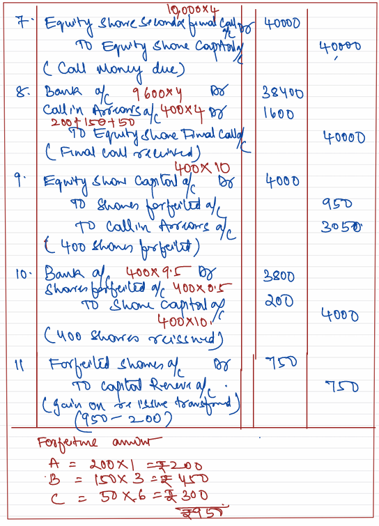 The shares of A, B and C were forfeited and were subsequently reissued for cash as fully paid-up at a discount of 5%.