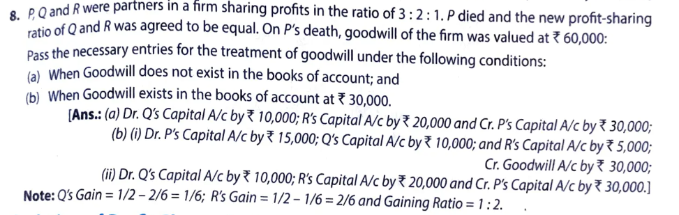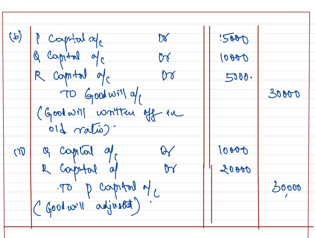 [Ans.: (a) Dr. Q’s Capital A/c by ₹ 10,000; R’s Capital A/c by ₹ 20,000 and Cr. P’s Capital A/c by ₹ 30,000;(b) (I) Dr. P’s Capital A/c by ₹ 15,000; Q’s Capital A/c by ₹ 10,000; and R’s Capital A/c by ₹ 5,000; Cr. Goodwill A/c by ₹ 30,000;