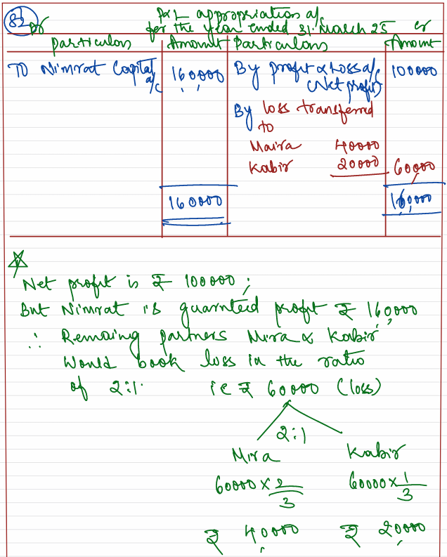 Nimrat, Maira, and Kabir are partners sharing profits in the ratio of 2:2:1. Nimrat is guaranteed a minimum profit of ₹ 1,60,000 per annum. Net Profit for the year ended 31st March 2023 is ₹ 1,00,000. Prepare Profit and Loss Appropriation Account for the year.