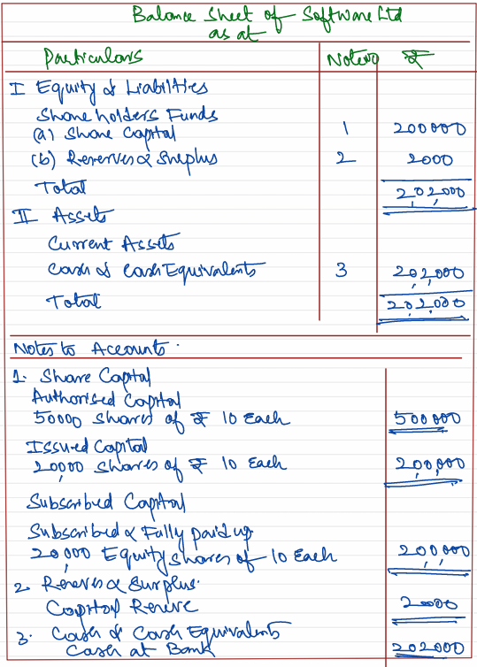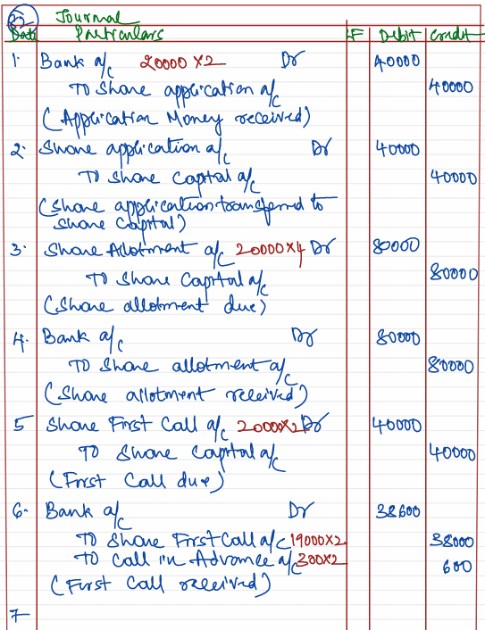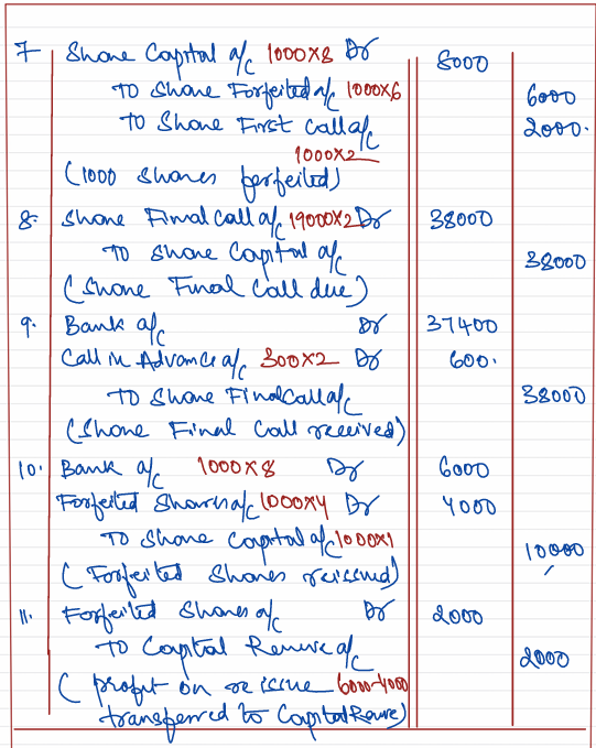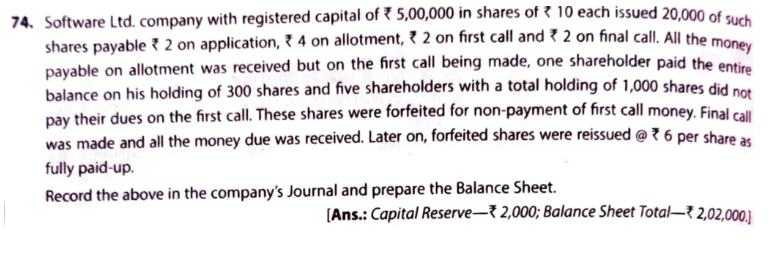 Software Ltd. company with registered capital of ₹ 5,00,000 in shares of ₹ 10 each issued 20,000 of such shares payable ₹ 2 on application, ₹ 4 on allotment, ₹ 2 on final call. All the money payable on allotment was received but on the first call being made, one shareholder paid the entire balance on his holding of 300 sahres and five shareholders with a total holding of 1,000 sahres did not pay their dues on the first call. These shares were forfeited for non-payment of first call money. Final call was made and all the money due was received. Later on, forfeited shares were reissued @ ₹ 6 per share as fully paid-up.