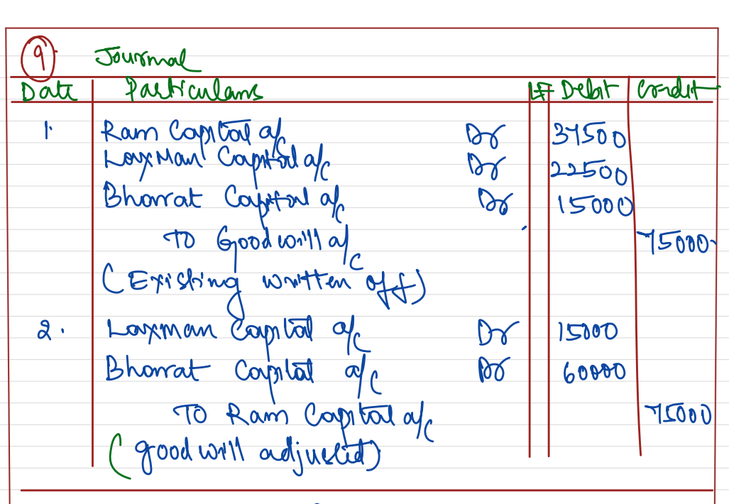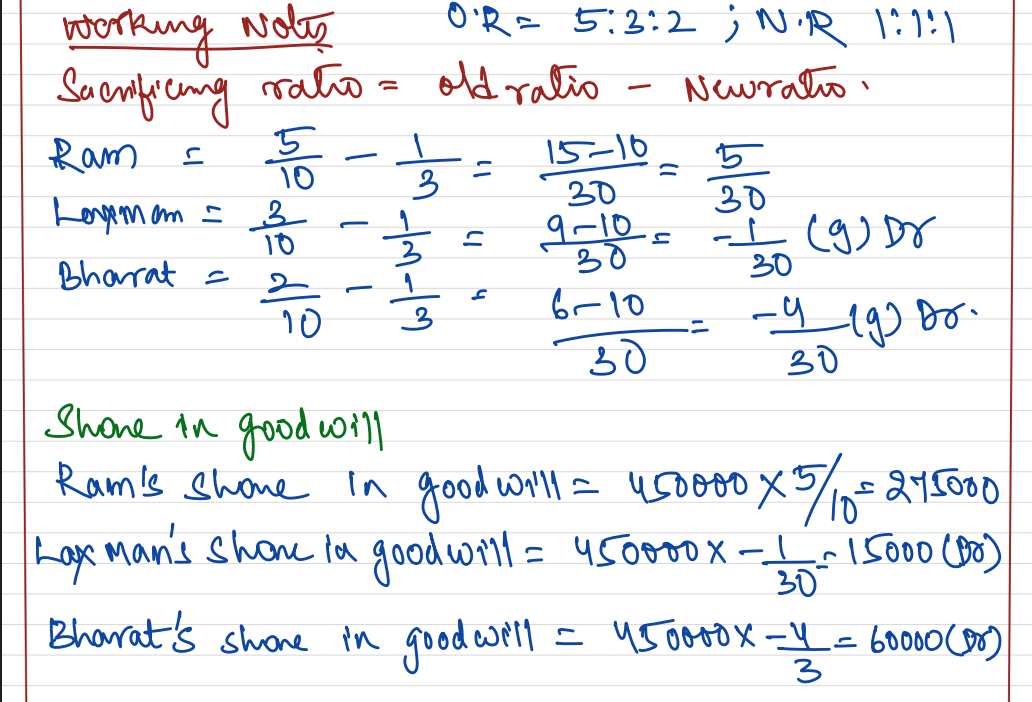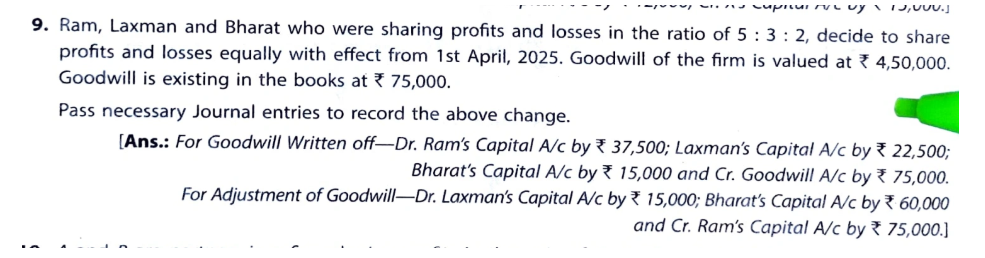 Ram, Laxman and Bharat who were sharing profits and losses in the ratio of 5 : 3 : 2, decide to share profits and losses equally with effect from 1st April, 2023. The goodwill of the firm is valued at ₹ 4,50,000. Goodwill is appearing in the books is at ₹ 75,000.