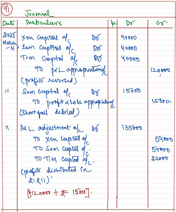 Xen, Sam, and Tim are partners in a firm. For the year ended 31st March 2024, the profit of the firm ₹ 12,00,000 was distributed equally among them, without giving effect to the following terms of the partnership deed: