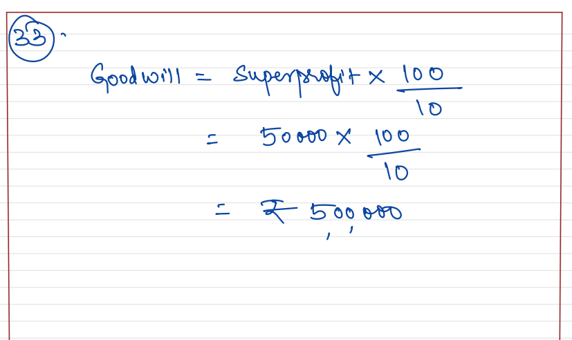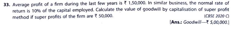 The average profit of a firm during the last few years is ₹ 1,50,000. In similar businesses, the normal rate of return is 10% of the capital employed. Calculate the value of goodwill by capitalisation of the super profit method if the super profits of the firm are ₹ 50,000.
